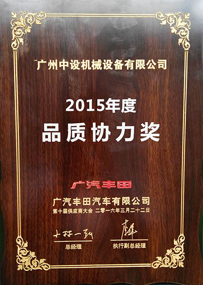 大會同時頒出品質(zhì)、原價、特別、品質(zhì)協(xié)力獎共181個獎,其中廣州中設(shè)機械設(shè)備有限公司獲得品質(zhì)協(xié)力獎。作為重要的合作伙伴,這項榮譽是廣汽豐田對廣州中設(shè)2015年在產(chǎn)品質(zhì)量、交付周期、售后服務(wù)、技術(shù)支持等方面的充分肯定。