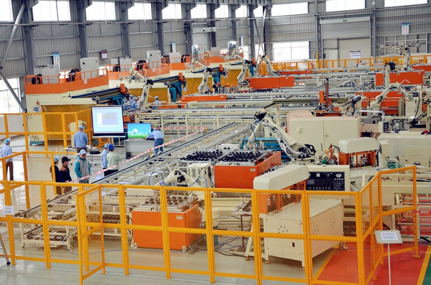 5.利用物聯(lián)網(wǎng)采集設(shè)備信息、結(jié)合中設(shè)的機(jī)器人視覺(jué)感知技術(shù)、機(jī)器人柔性化集成技術(shù)、機(jī)器人智能焊接技術(shù)實(shí)現(xiàn)了無(wú)人化生產(chǎn)模式,產(chǎn)線占地緊湊集約生產(chǎn)節(jié)拍48s/件,年產(chǎn)30萬(wàn)臺(tái):